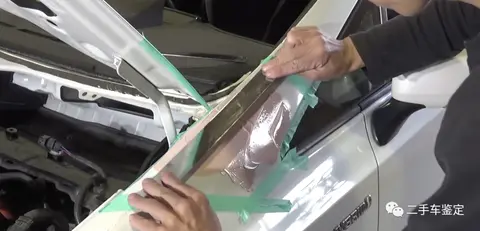 这个位置最终显现的特点就是左前翼子板后部有钣金修复的痕迹,当你用漆膜仪去测量的时候不仅仅是看这个数值有没有问题,你也要考虑它是由于哪些原因导致的这个位置有钣金痕迹。
