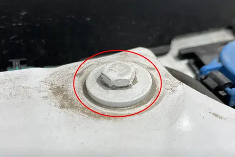 这是机盖的固定螺丝,这上边本来有个黑色的帽儿,大家在自己看车的时候记得取掉,不然就真成了看了个寂寞。然后现在大家再来看这颗螺丝,好像没什么问题是吧?我只提一个问题,油漆里为什么会有渣渣?