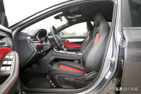 车身侧面运动气息不错,采用凸起的腰线进行装饰,看上去显得硬朗,A、B、C柱则采用熏黑式的处理,远远看上去整个车身呈现出溜背的造型,下部同样采用红色饰条进行点缀,再加上五辐式的轮毂和红色卡钳,整车表现力不错。