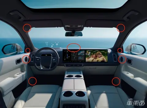 理想汽车目前并没有公布车内扬声器的数量以及总功率,但车东西从前排图片中共找到9个音响设备(包括麦克风),主/副驾驶侧各有4个,中控后方有一个。