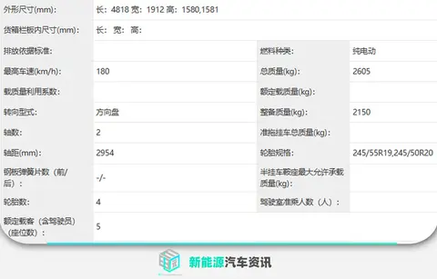 尺寸方面,新车长宽高分别为4818×1912×1580/1581mm,轴距为2954mm。车尾部分,新车采用了贯穿式的熏黑灯组设计,并搭配了小尺寸车顶扰流板与后窗扰流板的双扰流设计。动力上,新车搭载最大功率180kW的电动机。