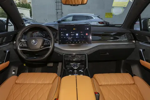 比亚迪唐DM中控台上方采用大面积皮质带缝线包裹,下方仪表台采用一块12.3英寸全液晶仪表,方向盘采用皮质包裹的平底式方向盘,中间一块悬浮式15.6英寸中控大屏,整个内饰看起来比较有科技感。