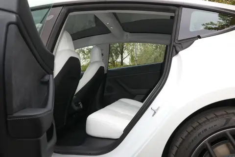 特斯拉Model 3座椅方面采用仿皮材质座椅,坐起来偏硬舒适性一般。接下来小编把前排调整到适合我的坐姿,前排头部空间为1拳零1指。保持前排座椅不变进入到后排,后排腿部空间为2拳整。后排头部空间为4指。