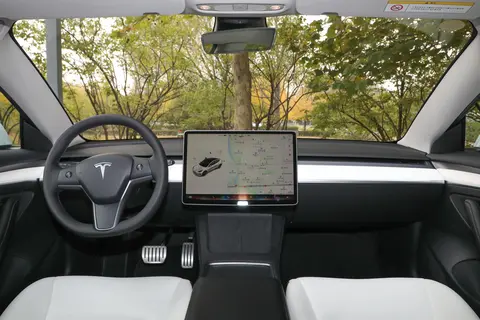 特斯拉Model 3中控台上方采用大面积搪塑软质材料包裹,下方仪表台采用一根白色饰板贯穿着皮质包裹的多功能方向盘,中间一块悬浮式15英寸中控大屏,整个内饰看起来很简洁。