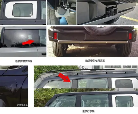 细节部分,从细节图中可以看出,该车型根据不同的车型来搭配不同的配置,值得一说的是,新款车型预计将取消防滚架的设计,取而代之的是无框的车门以及全景的天窗。