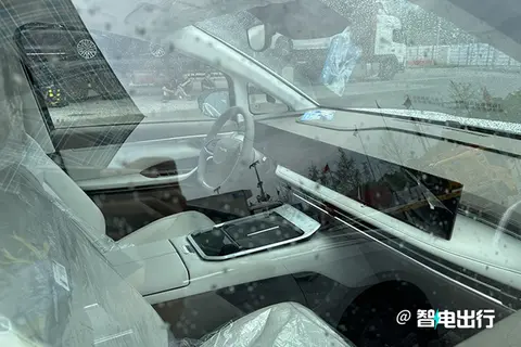 大家MIFA7采用贯穿式大联屏设计,简化全部物理按键,中央扶手箱和仪表台中间为通透布局,中央扶手箱宽厚,预计内部有较大储物空间。中央扶手面板提供手机无线充电和杯架,方向盘为圆形多功能三幅式,并搭配怀挡拨杆。