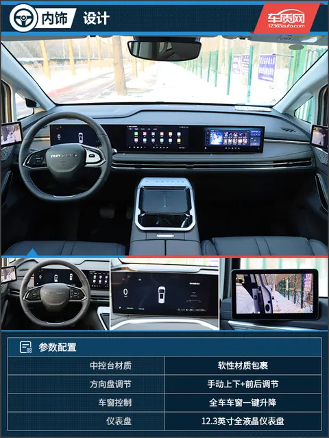 双辐式方向盘粗细均匀,两侧的多功能控制区采用实体拨杆与隐藏式按键的组合,科技感十足。全液晶仪表整体UI设计较为简洁,支持自定义功能,可显示的车辆信息比较丰富。主副驾驶车门上还分别提供了电子外后视镜显示屏,驾驶员可调节两侧显示屏的亮度和车外摄像头的角度,并可控制车外摄像头电加热以及电动折叠,日常使用十分方便。