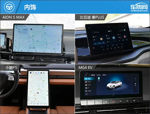 在内部配置上,四款车型的基础配置表现都很全面,在进阶配置上则有所不同。其中,AION S MAX提供了部分配置选装,并且还独享车内氛围灯以及ETC装置等;小鹏P5和比亚迪秦PLUS表现相近,但比亚迪秦PLUS的前排手机无线充电以及驾驶位电动座椅记忆功能的缺失,令自身实用性略打折扣。反观MG4 EV,整体表现欠佳,配置上的缺失较多。