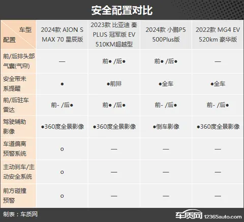在安全配置上,四款车整体表现接近,都能给驾乘人员充分的保护。其中,比亚迪秦PLUS的配置相对较为完善,配备了前/后排头部气囊(气帘)和前驻车雷达;AION S MAX安全配置表现中规中矩,不过提供了部分配置的选装机会。相比之下,小鹏P5和MG4 EV的表现较为一般。