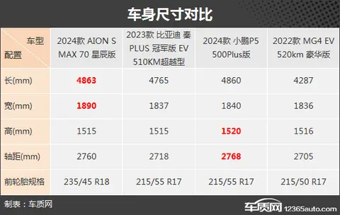 在车身尺寸方面,四款车型都定位为紧凑型车,其中的AION S MAX在长度和宽度方面领先其它三款车型,小鹏P5的车身高度和轴距在四款车型中最优,车内乘坐空间在一定程度上要好于其余三款车型。此外,由于MG4 EV为两厢车,所以其车身长度与其它三款车型相比并不占优势。