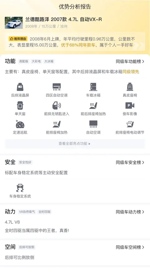 这篇文章将为您详细介绍兰德酷路泽这款车型,这是一款非常受欢迎的SUV,无论是在城市马路还是在崎岖的山路都有出色的表现。我们来看一下这辆车的基础信息。这是一辆2007款的兰德酷路泽4.7L自动VX-R,从2008年6月开始上牌,至今已经行驶了15万公里。根据新车指导价,这款车的价格是112.78万元,而现在卖家的报价是27.80万元。这辆车的车源地和上牌地都是在沧州,车身颜色是白色,至今还没有进行过任何过户。