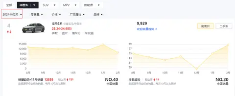 根据懂车帝发布的2024年2月份中型车销量排行榜来看,在2月份整体的汽车销量表现较为一般,或许是受到春节假期影响等因素,在接下来的3月份销量会有一定的提升。今天我们要说的这款车则是一直关注度非常高的宝马3系(图片|配置|询价)了。对于这款车想必大家也都非常熟悉,在2月份宝马3系这款车的销量表现还是较为不错的,凭借9929辆的销量成绩拿下了2月份中型车排行榜第4名。