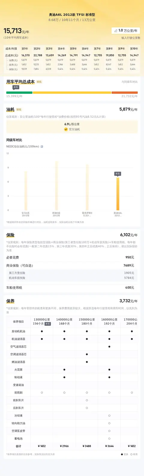 除了考虑购车费用外,日后的使用开销也不容忽视。根据我们的估算,这辆车的年均综合用车成本约1.6万元左右。当然,具体金额会随个人使用情况有所浮动。