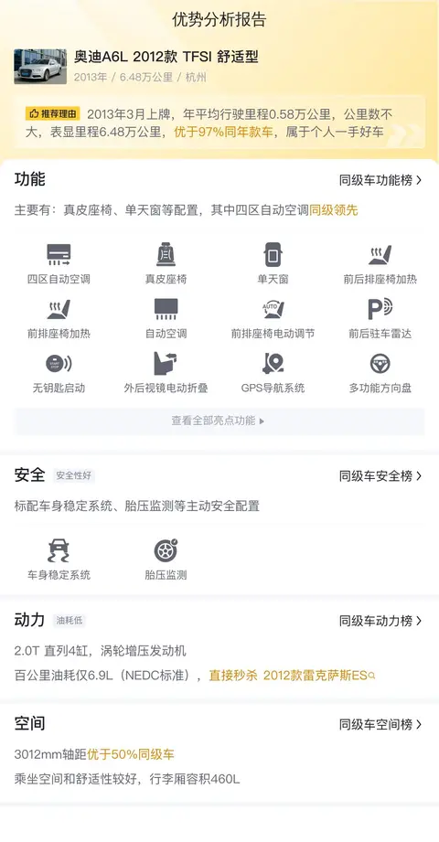 欢迎各位车友,我们今天要聊的是一款豪华品牌的中大型轿车——奥迪A6L(图片|配置|询价)。说到奥迪A6L,它可以说是奥迪在中国市场的销量支柱之一,以其沉稳内敛的设计和精湛工艺赢得了众多商务精英的喜爱。好了,我们还是言归正传,今天我们要为大家带来一辆二手奥迪A6L,让我们一起来看看它的具体信息吧!该车的具体版本为“奥迪A6L 2012款 TFSI舒适型”,首次上牌时间为2013年3月,至今已跑了6.48万公里。该车属于浙江牌照,在这需要注意一下,这个车的排放标准为国IV,当前只能在限行国六标准的城市外上牌。新车当年的指导价为43.46万元,而如今二手车报价仅为9.20万元。下面,让我们通过一组实拍照片,来更加直观的感受一下这台车的真实状态。