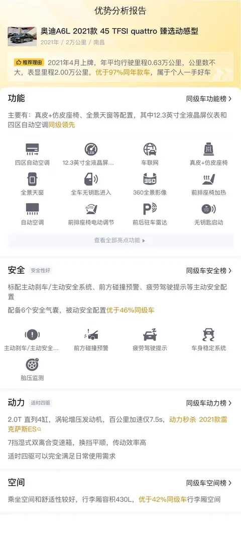 以上所述均为一般性信息,而在真实的市场环境中,每辆车都有其独特的价值。文中用车成本、市场行情、优势分析、同款比价等数据均源自懂车帝数据库,仅供参考,车况信息需要线下结合车辆实际情况进行综合参考。