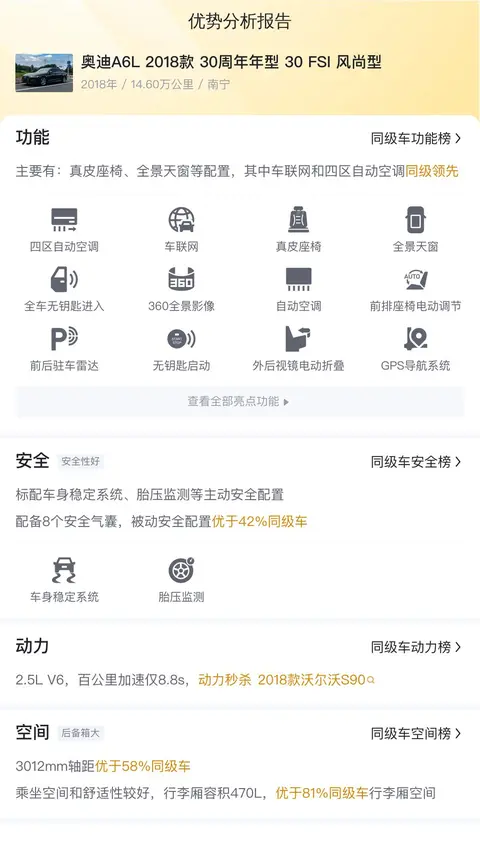 除了外观和内饰外,车辆的配置清单也是评估其价值的重要依据。在这辆奥迪A6L上,配备了诸如无钥匙启动、定速巡航、360度全景影像、倒车影像、自动停车和上坡辅助等实用功能,其中特别值得一提的是定速巡航和360°全景摄像头,它们分别提供了便捷的高速公路驾驶体验和全面的四周视角,增强了行车的安全性和便利性。