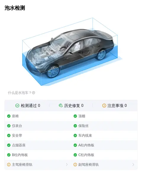 除了外观检测,在车况部分,除了外观、内饰功能的检测,更多买家关注的是这辆车是否为“三非”车辆,三非就是指非重大事故、非火烧、非水泡。因为事故车、泡水车、火烧车都存在较大的安全隐患。不过您放心,这辆车已经通过了事故检测、火烧检测和泡水检测,可以确定它非重大事故车、非火烧车、非泡水车。