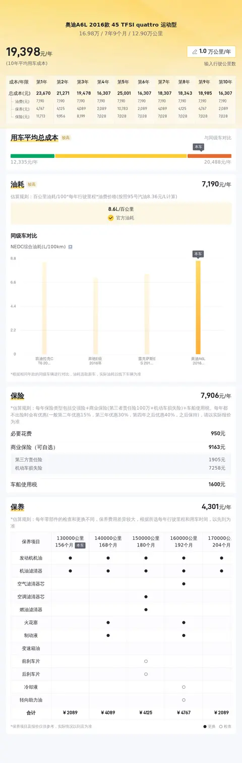 就用车成本而言,根据估算,这辆车的年均综合用车成本大约在1.9万元左右。当然,具体的费用会根据车主的使用习惯和维护情况有所不同。