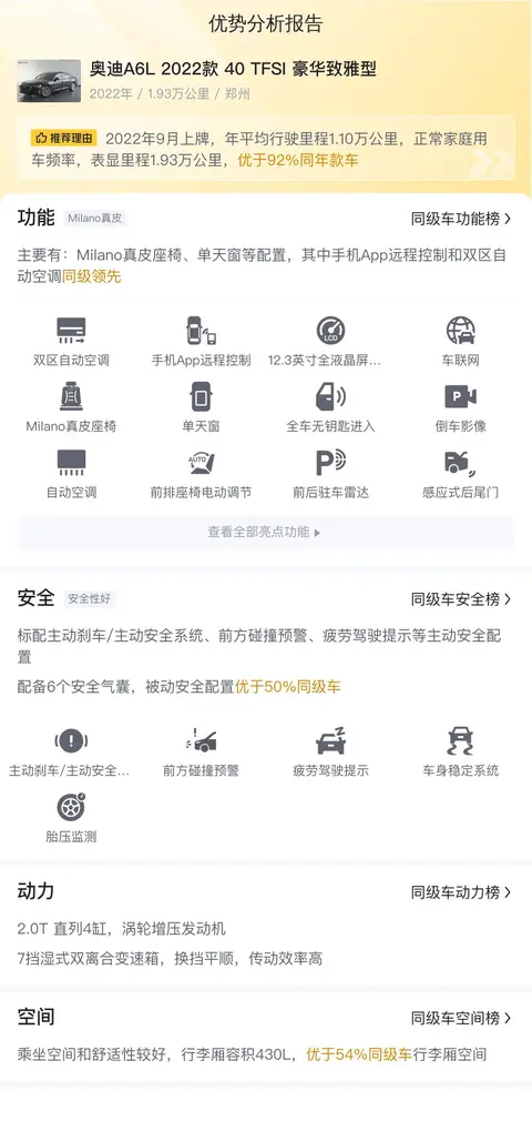 首先,我们先了解一下这辆二手奥迪A6L的基础信息,该车的具体版本是——奥迪A6L 2022款 40 TFSI 豪华致雅型。该车定位于中大型轿车,于2022年09月首次上牌,至今已跑了1.93万公里。该车是在河南郑州上牌,目前处于牌照状态。车况明显属于那种买了就开、买了就用的那种,没啥说的,直接看车就行。这车新车指导价42万,现在二手车报价28.80万,比新车便宜了13万多。