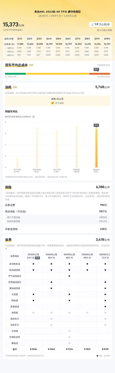 在用车成本方面,根据我们的估算,这辆车年均综合用车成本大概在每年1.5万元左右。这项支出根据车主的实际使用情况可能会有所不同。