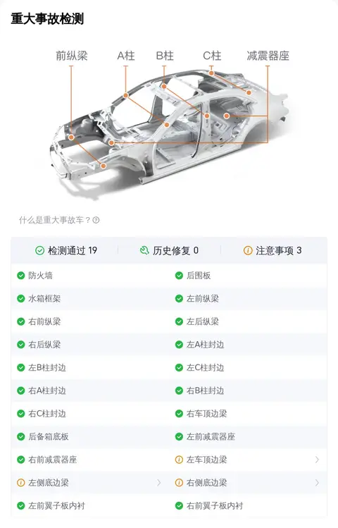 在事故检测部分,该车顺利通过了19项检测,并在3项检测中存在瑕疵,具体表现为左车顶边梁、左侧底边边梁、右侧底边边梁存在划伤。这里需要注意的是,这辆车已经通过了事故检测、火烧检测和泡水检测,确定它非重大事故车、非火烧车、非泡水车。