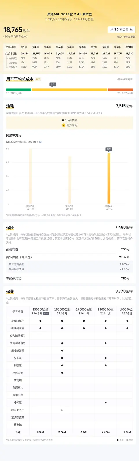 在用车成本方面,根据估算,这辆车年均综合用车成本大概在每年1.9万元左右。这里要说的是,这个用车成本跟车主的用车方式和习惯有直接关系,所以说这个金额会有明显的差异。