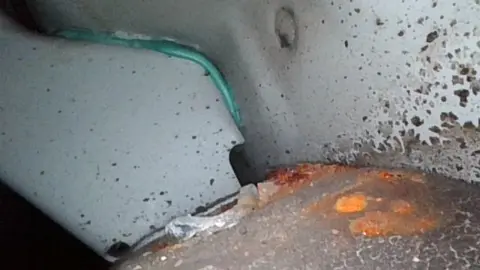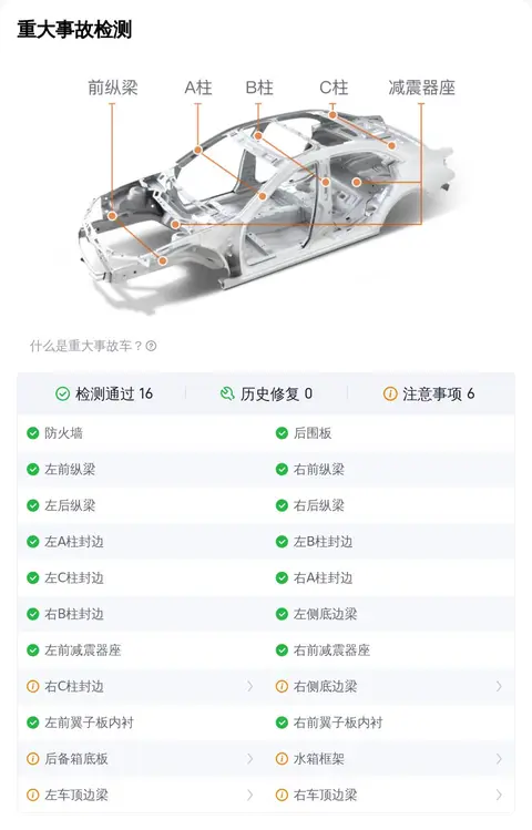 在事故检测排查中,该车一共22项检测,有16项通过,查到了6处瑕疵,具体为水箱框架有拆卸痕迹,左车顶边梁、右车顶边梁存在喷漆修复,右侧底边梁存在锈蚀腐烂,右C柱封边存在凹陷,后备箱底板有尘沙。