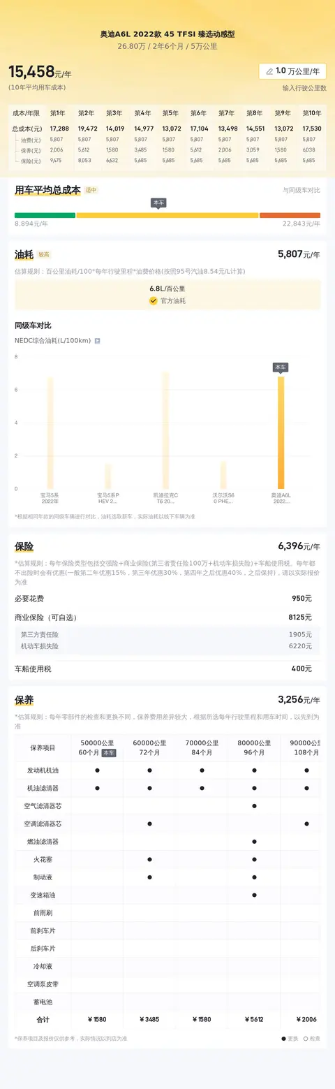 关于用车成本,根据估算,这辆车年均综合用车成本大概在每年1.5万元左右。这个费用跟车主的使用强度是有直接关系的,所以说这个只能作为一个参考。