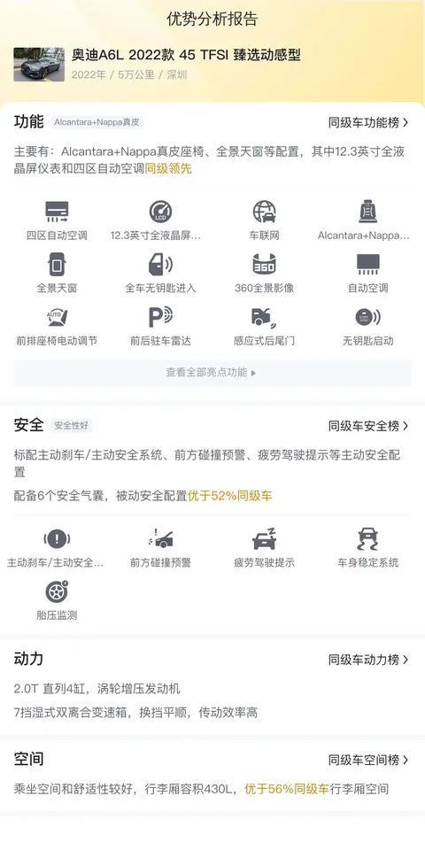 接下来我们了解一下这辆二手奥迪A6L的基础信息,该车的具体版本是2022款的45 TFSI 臻选动感型。该车定位于中大型轿车,于2022年1月首次上牌,至今已行驶约5万公里。新车当年的指导价格为44.38万元,如今二手车报价为26.80万元。该车上牌地与出售地均为深圳,有过1次过户记录。车身颜色为深灰色,符合国VI排放标准。