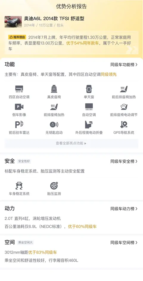 奥迪A6L(图片|配置|询价)作为一款豪华中大型轿车,在国内享有极高的知名度。它以其出色的舒适性和科技感赢得了众多消费者的青睐。今天我们就为您带来一辆二手奥迪A6L。该车的具体版本为2014款 TFSI 舒适型,属于2014年的车型,表显里程为13万公里,0过户,黑牌照。此车的上牌日期为2014年7月,目前在包头地区销售,车源所在地也是包头。新车当年的指导价为40多万,现在二手车报价仅为11.6万,比新车便宜了33万多。好了,接下来让我们看看这台车的表现如何。
