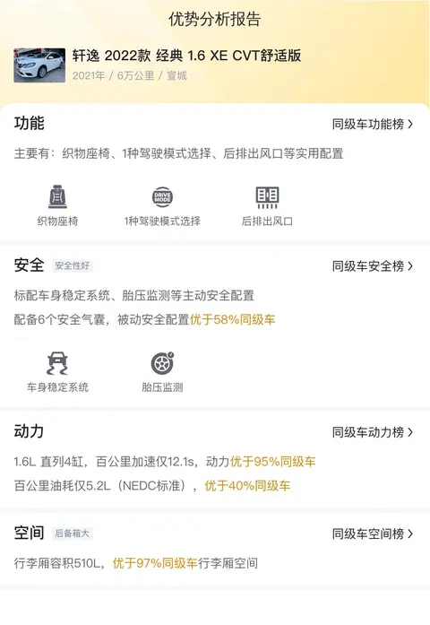 接下来,让我们来看看这款车的市场行情。根据大数据预估显示,这款轩逸2022款经典1.6XE CVT舒适版的二手车市场价格大约在5.73万元至6.93万元之间。当然,具体的售价会受到车辆状况、使用年限等因素的影响。