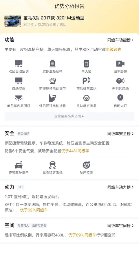 总的来说,购买二手车是一个复杂的过程,涉及的因素很多。除了价格外,车况也是决定是否购买的重要因素。如果您对这款二手宝马3系感兴趣,建议您亲自试驾并仔细检查车况,确保购买到满意的车辆。文中所述的用车成本、市场行情、优势分析、同款比价等数据仅供参考,车况信息需要线下结合车辆实际情况进行综合参考。