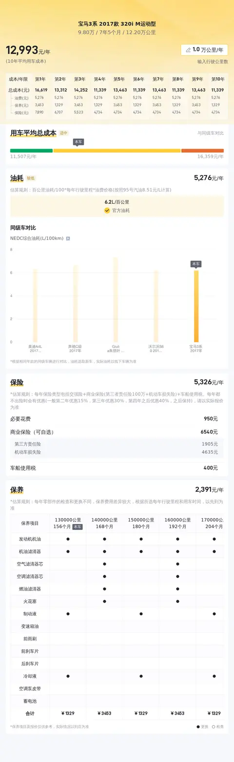 说到二手车,市场行情自然是大家关注的重点。目前这款宝马3系 2017款 320i M运动型的二手车行情大致在11.31万至13.52万之间,而本文介绍的这款二手车报价仅为9.80万,价格相对较低,性价比不错。用车成本方面,根据估算,这辆车年均综合用车成本大概在每年1.3万元左右。