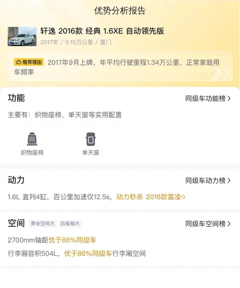 这辆轩逸的具体版本是——轩逸2016款经典1.6XE自动领先版,定位是紧凑型车,外观颜色为白色,内饰是深色配色。累计行驶里程是9.15万公里,该车首次上牌是在2017年9月,有1次过户记录。车源所在地和牌照所在地均在厦门,同时还是国V排放标准。新车含税价为12.47万,二手车报价是3.30万。