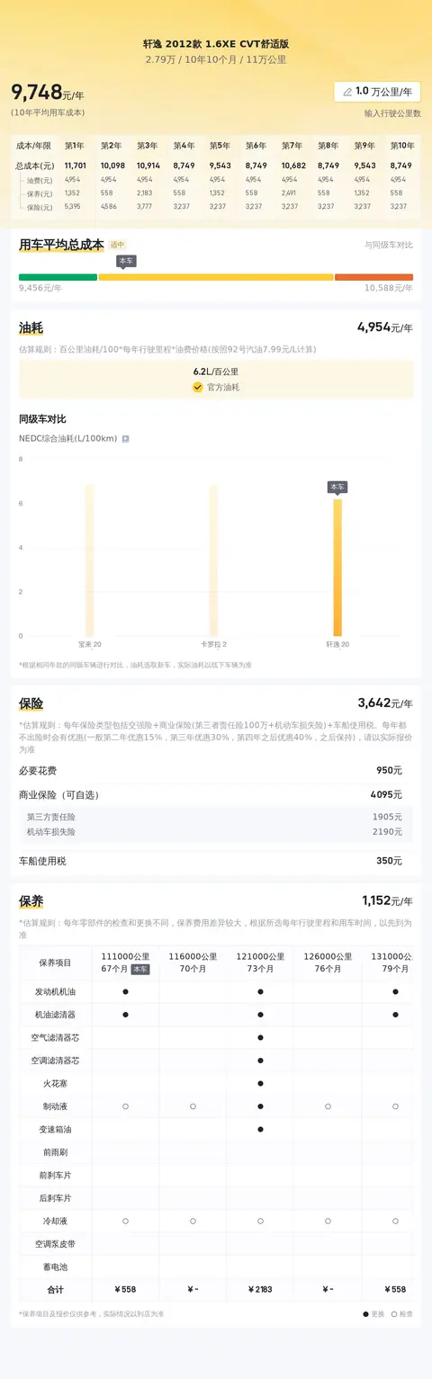 接下来,让我们来看看这款车的市场行情和用车成本。目前,这款车的二手车行情大致在3.03万至4.10万之间,当然,具体的售价会受到车龄、里程和保养状况等因素的影响。就用车成本而言,根据估算,这辆车的年均综合用车成本约为1.0万元左右,这一数据基于每年行驶1万公里、SB级车险和常规保养的假设。