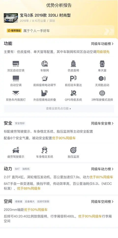 对于一款豪华中型车来说,丰富的配置是必不可少的。这辆宝马3系配备了仿皮座椅、单天窗、非全液晶仪表盘以及车联网等配置,其中无钥匙启动、上坡辅助、语音识别控制和自动大灯等配置尤为实用。安全配置方面,标配疲劳驾驶提示、车身稳定系统、胎压监测等主动安全配置,以及5个安全气囊,提供全方位的安全保障。