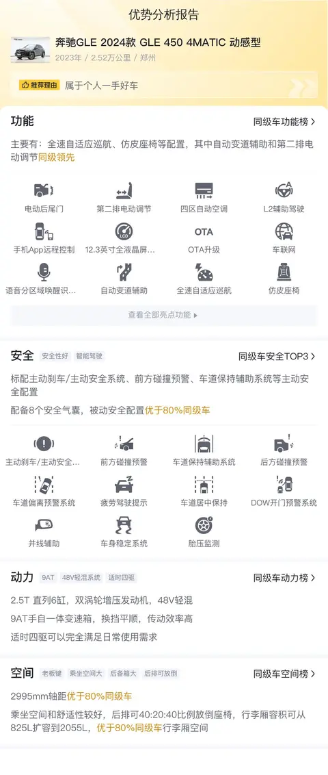 据估算,奔驰GLE 2024款 GLE 450 4MATIC 动感型的用车成本是13356元/年,不算低,同级车最低是11424元/年,最高是16920元/年,而它的行驶里程只有2.52万公里,所以油耗偏低。
