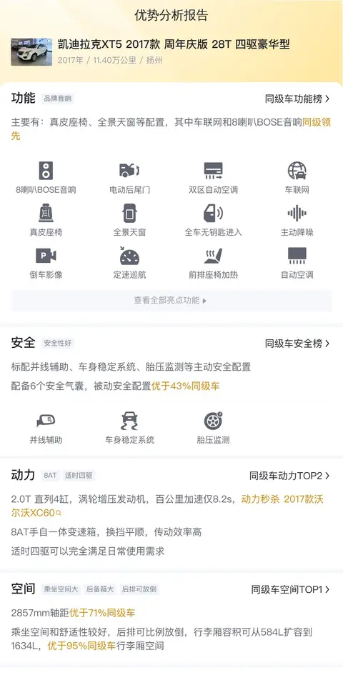 这辆凯迪拉克XT5 2017款 周年庆版 28T 四驱豪华型优点是车况比较明了,作为一辆中型SUV,空间较大,适合全家出行。配置丰富,舒适性好。动力强劲,无论是日常驾驶还是高速超车,都能提供充足的动力。