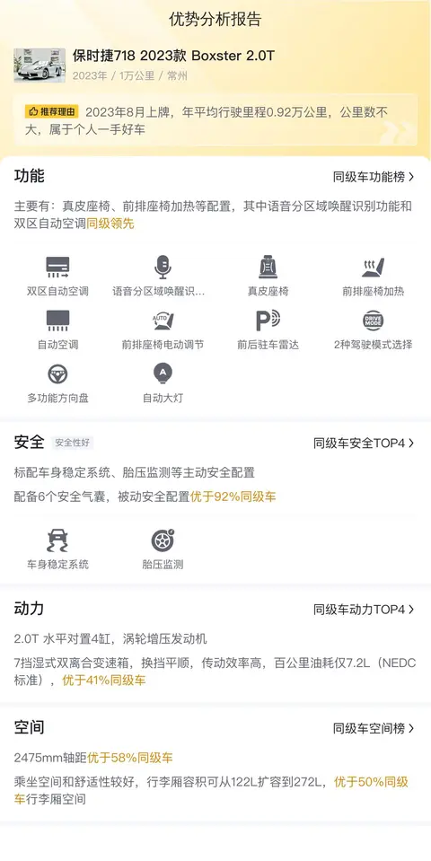 二手保时捷718 2023款 Boxster 2.0T是一款集时尚、高端、动感于一体的跑车,从外形设计到内饰细节,都体现了保时捷这个豪车品牌的工艺和技术。它的驾驶操控灵活,动力性能强劲,并且具有较高的安全配置。不过,作为一款高端跑车,它的维护保养成本也相对较高,后排座椅空间较小。在购买时,请根据个人的经济实力和实际需求来选择。