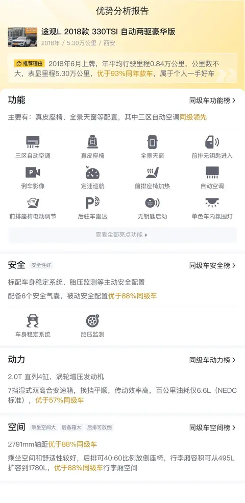 综上所述的新车含税价、用车成本、市场行情、优势分析、同款比价等数据仅供参考。在配置部分,因为二手车非标品,车辆可能会存在配置改装的情况,具体车况信息需要线下结合车辆实际情况进行综合参考。