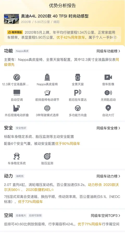 在激烈的二手车市场竞争中,这辆奥迪A4L 2020款 40 TFSI 时尚动感型在动力、空间、操控以及安全性能等方面均表现出色。与同级别车型相比,它不仅继承了奥迪品牌的豪华基因,同时也具备了更高的性价比和实用性。通过对这辆车与雷克萨斯ES、沃尔沃S90等竞品的对比分析,我们可以清晰地看到奥迪A4L在各方面所具有的优势。无论是在动力输出、燃油经济性,还是在车内空间、操控稳定性等方面,奥迪A4L都能为消费者提供更为出色和均衡的驾驶体验。当然,每款车型都有其独特的卖点和目标消费群体。例如,雷克萨斯ES注重舒适性和静谧性;沃尔沃S90强调安全性和环保理念。而奥迪A4L 2020款 40 TFSI 时尚动感型则在保持豪华感和科技感的同时,也兼顾了日常使用的便利性和经济性。消费者可以根据自身的需求和偏好来选择最适合自己的车型。但从整体来看,这辆奥迪A4L 2020款 40 TFSI 时尚动感型二手车无疑是一款集豪华、科技、实用于一体的优质选择。它不仅能满足消费者对于高品质生活的追求,同时也能在日常使用中为消费者带来愉悦和舒适的驾驶体验。