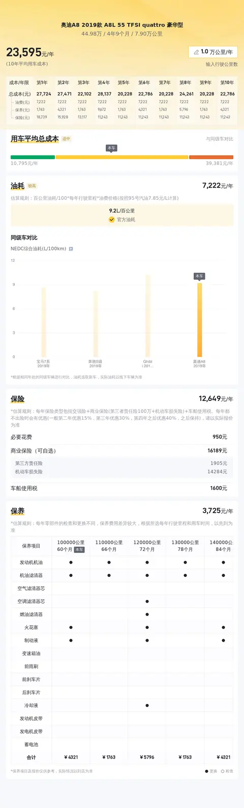 据估算,同级车的最低用车成本是18598元/年,最高是47724元/年,奥迪A8 2019款 A8L 55 TFSI quattro豪华型是23698元/年,所以不算低。