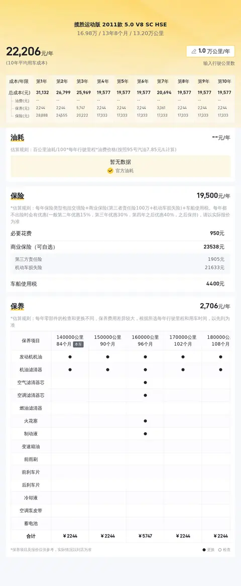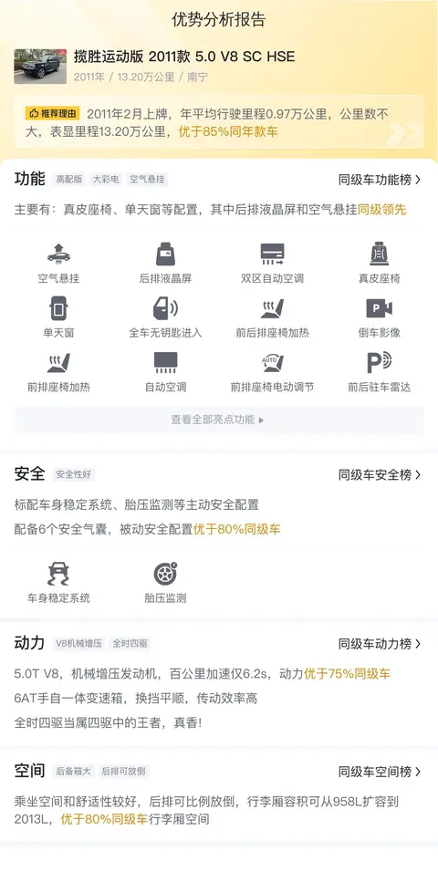 综上所述,这款揽胜运动版2011款5.0 V8 SC HSE作为一款豪华中大型SUV,在动力性能、驾乘舒适度以及越野能力等方面表现出色。然而,由于车辆已有一定的年岁和里程积累,潜在的维修保养成本可能会较高。对于追求豪华品牌和强大越野性能的消费者来说,这款车无疑是一个值得考虑的选择。但需要注意的是,由于该车未提供第三方检测报告,因此车况信息需要线下结合车辆实际情况进行综合参考。