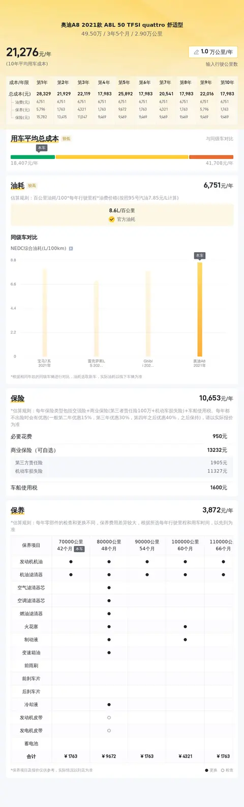这辆奥迪A8L的年均综合用车成本约21183元,这项花销是跟车主的实际用车场景和使用强度有直接变化的。