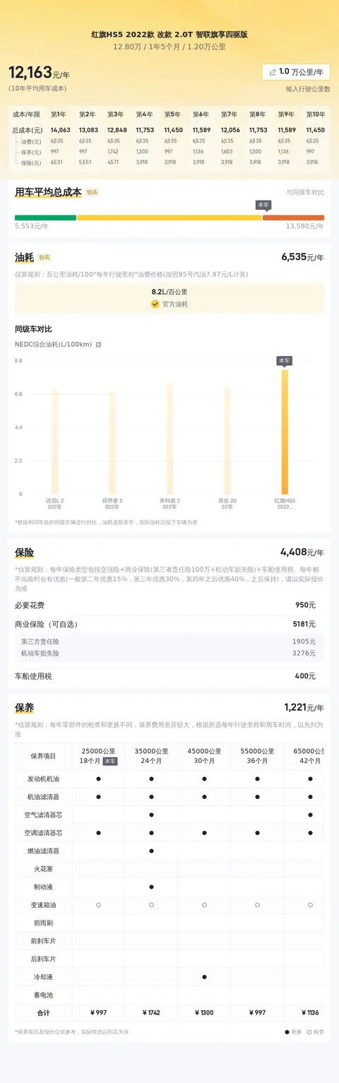 目前这款红旗HS5在二手车市场的行情大约在12.06万至14.51万之间,本文这辆红旗HS5报价12.8万,符合正常的市场波动范围。按照每年行驶2万公里计算,10年用车成本约238033元。
