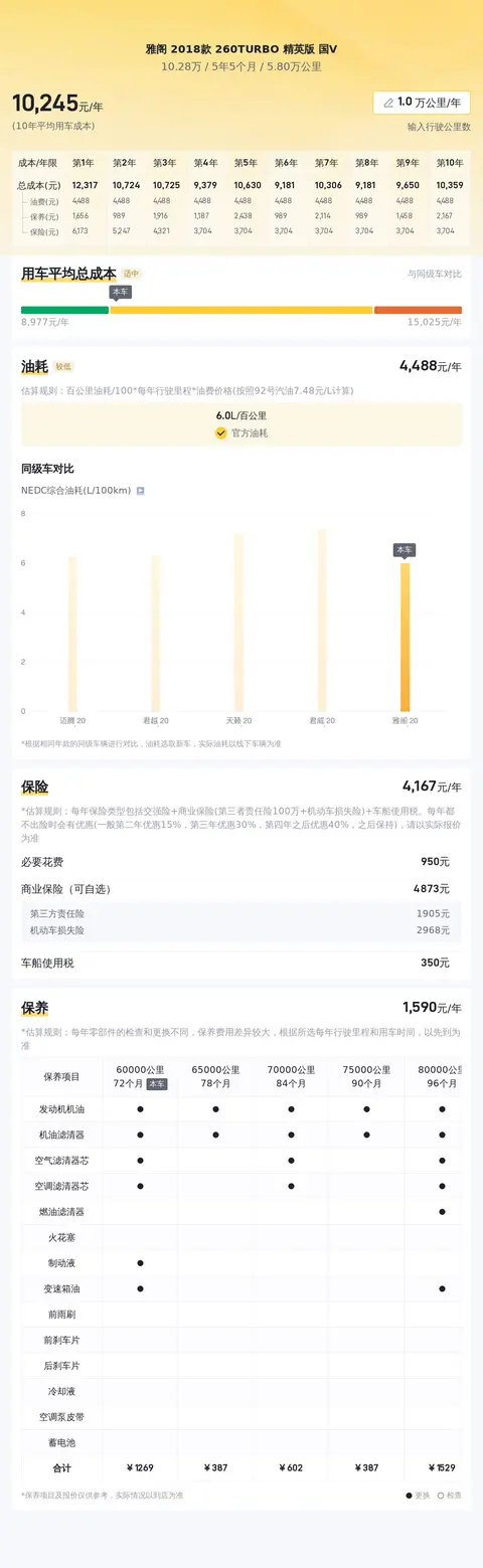 从用车成本来看,同级车的最低10年平均用车成本是6905元/年,最高是12791元/年,雅阁 2018款 260TURBO 精英版 国V是10055元/年,处于适中的水准,但它的油耗低,1.5T的发动机动感出色,又很省油。