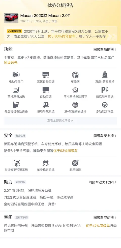 Macan最明显的优势就是这台车的价格相对准入门槛较低,让更多喜欢保时捷的车友能够拥有一台保时捷,同时基础配置齐全,比如空气悬架、电吸门、电动尾门、座椅加热还有BOSS音响等等都有,日常使用豪华感十足。这辆Macan 2020款 Macan 2.0T本身车龄不高,里程值也很低,整体成色很新,性价比还是不错的。