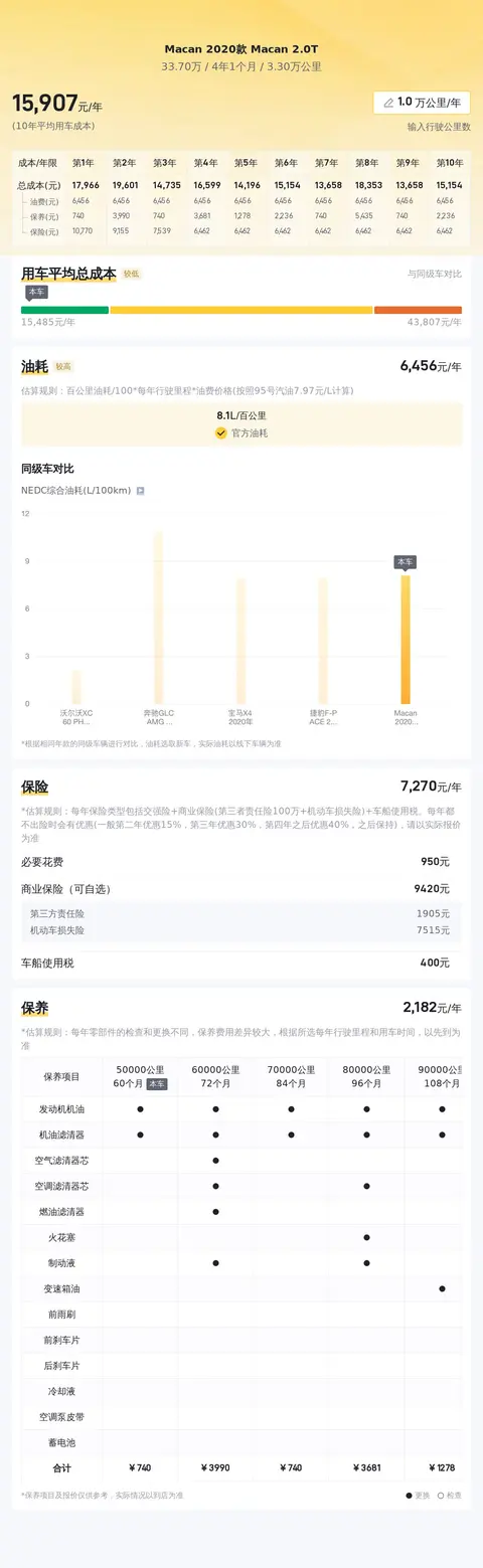 据估算,Macan 2020款 Macan 2.0T的用车成本较低,因为同级车的最低用车成本是15988元/年,最高是20502元/年,而Macan 2020款 Macan 2.0T是16354元/年,所以较低。