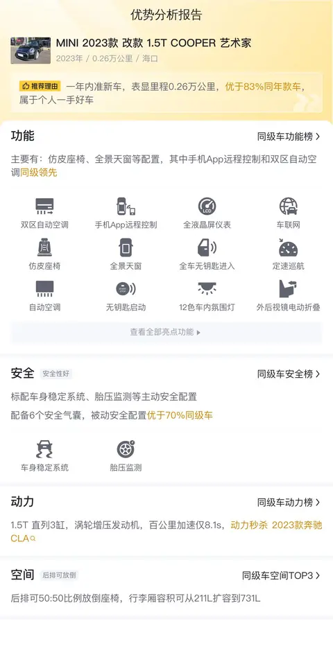 如果有车友你正在找一辆二手MINI,今天这篇介绍可得仔细瞧好了!咱们现在要聊的可不是一般的二手MINI,而是2023款改款1.5T COOPER 艺术家,2023年12月才上的牌,算是准新车啦!跑的里程也才0.26万公里,真的是轻轻松松刚磨合好呀~