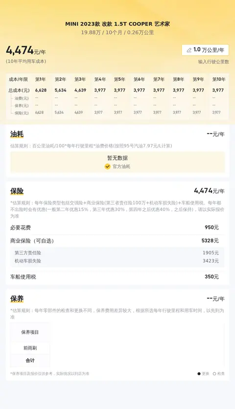 这款二手MINI按照每年行驶1万公里计算,10年平均用车成本大约在每年1.2万元左右。具体费用包括油费、保险费、保养费等。其中,油费大约在每年5600元左右,保险费约为5100元/年,保养费预计为1500元/年。这些费用会根据实际使用情况、油价波动、保险政策等因素有所变化。